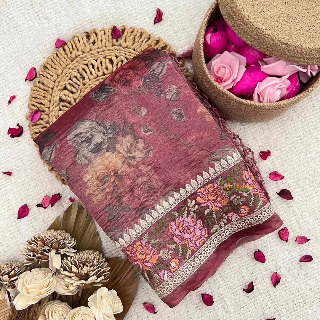 Drape yourself in timeless elegance with this exquisite wine burgundy organza saree, a masterpiece of handloom craftsmanship. Delicate floral motifs dance across the fabric, while intricate rose border embroidery adds refined sophistication to every drape. The lightweight organza ensures graceful movement and breathable comfort, making it perfect for festive occasions, weddings, and celebrations. Each piece reflects the artistry of skilled weavers, combining traditional techniques with contemporary aesthetics. Elevate your ethnic wardrobe with this stunning saree that seamlessly blends heritage and elegance.
