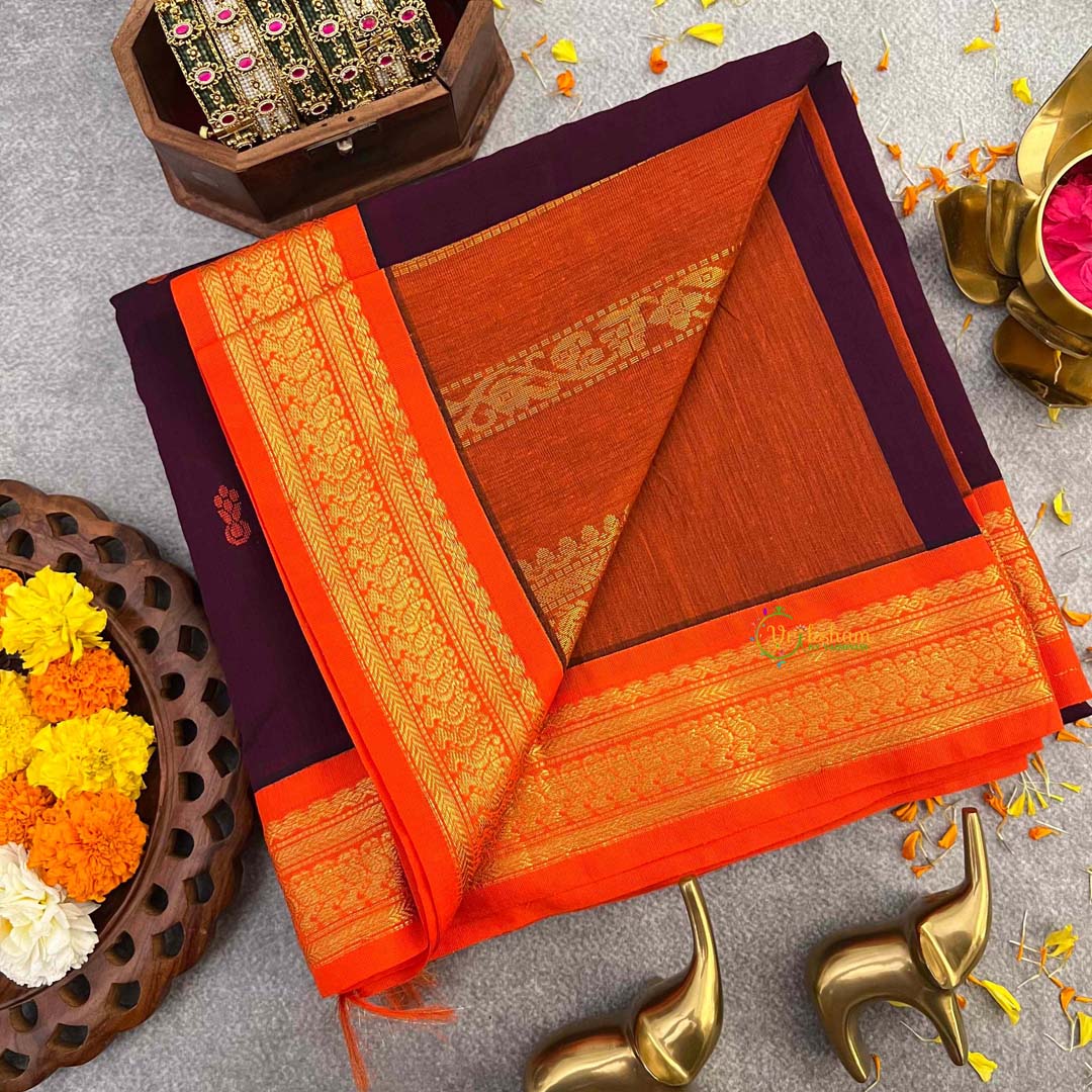 Discover timeless elegance with this stunning Kalyani cotton saree, featuring a rich wine base complemented by a vibrant orange border and ornate butta detailing. Constructed from premium Kalyani cotton, this saree provides exceptional comfort and breathability, making it suitable for extended wear throughout the day. The bold color combination creates a striking visual impact while maintaining sophisticated appeal, perfect for festive celebrations, weddings, and special occasions. The traditional butta design adds depth and character to the weave, showcasing authentic Indian textile heritage. The natural fabric ensures excellent drape, durability, and effortless maintenance. An investment piece that seamlessly blends cultural authenticity with contemporary style preferences.