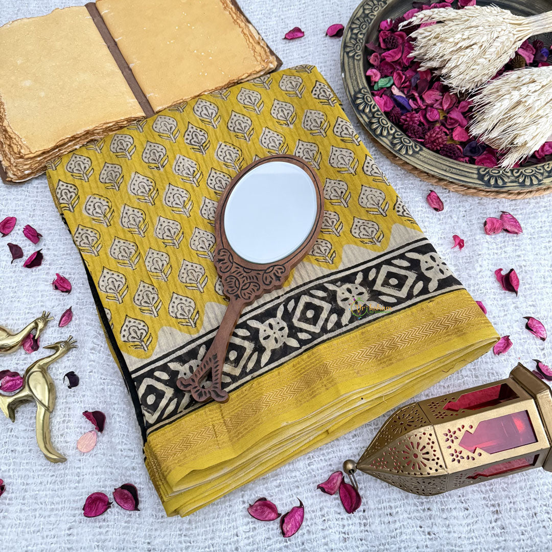 Exquisite Yellow Leaf Print Maheshwari Cotton Silk Saree, meticulously handcrafted on traditional handlooms. This lightweight blend of cotton and silk offers exceptional breathability and a subtle sheen, making it the perfect choice for summer elegance. The distinctive leaf print pattern showcases artisanal craftsmanship while providing sophisticated comfort for both casual gatherings and formal occasions.