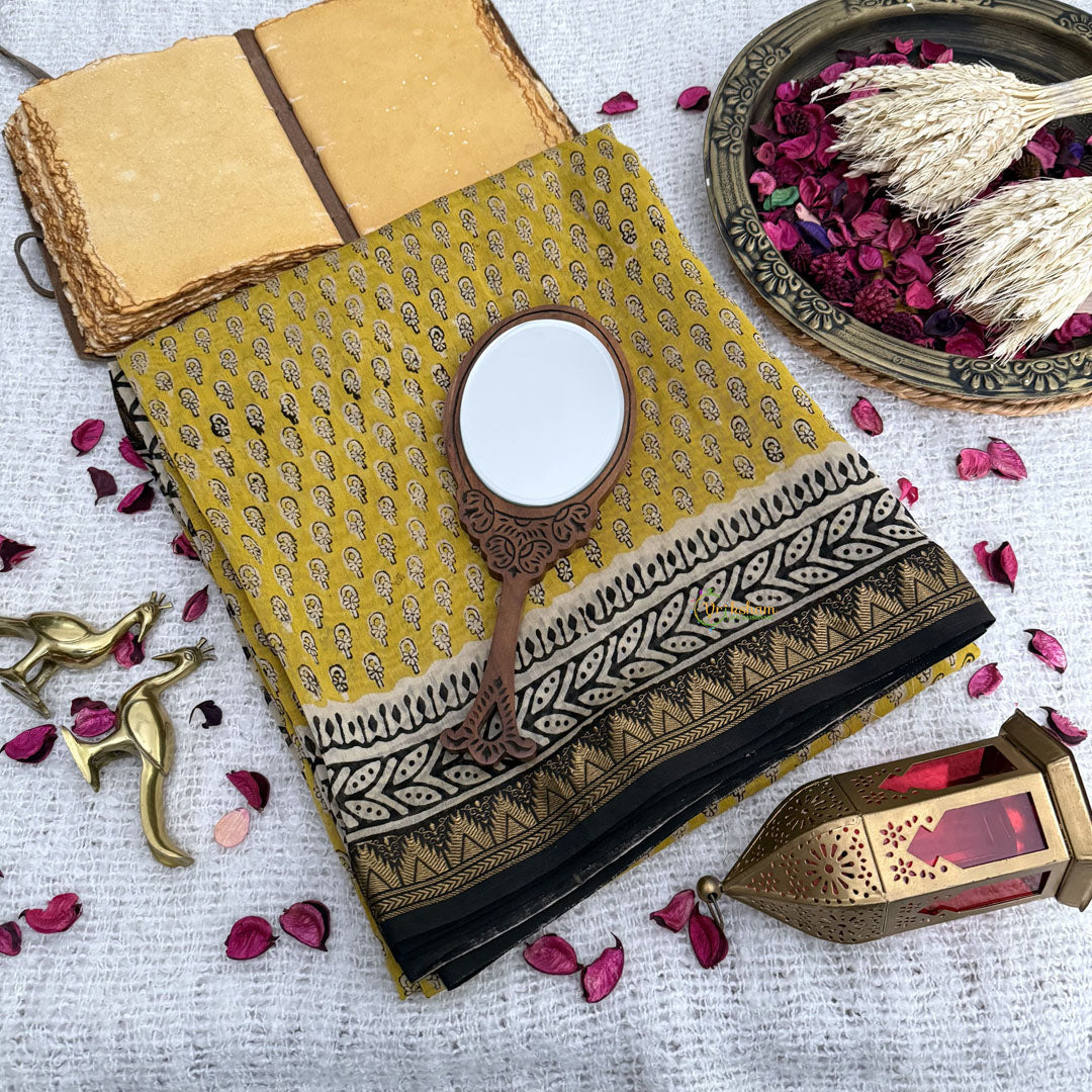 Exquisite Yellow Printed Maheshwari Cotton Silk Saree, meticulously handcrafted on traditional handlooms. This lightweight blend of cotton and silk offers exceptional breathability and a subtle sheen, making it the perfect choice for summer elegance. The distinctive leaf print pattern showcases artisanal craftsmanship while providing sophisticated comfort for both casual gatherings and formal occasions.