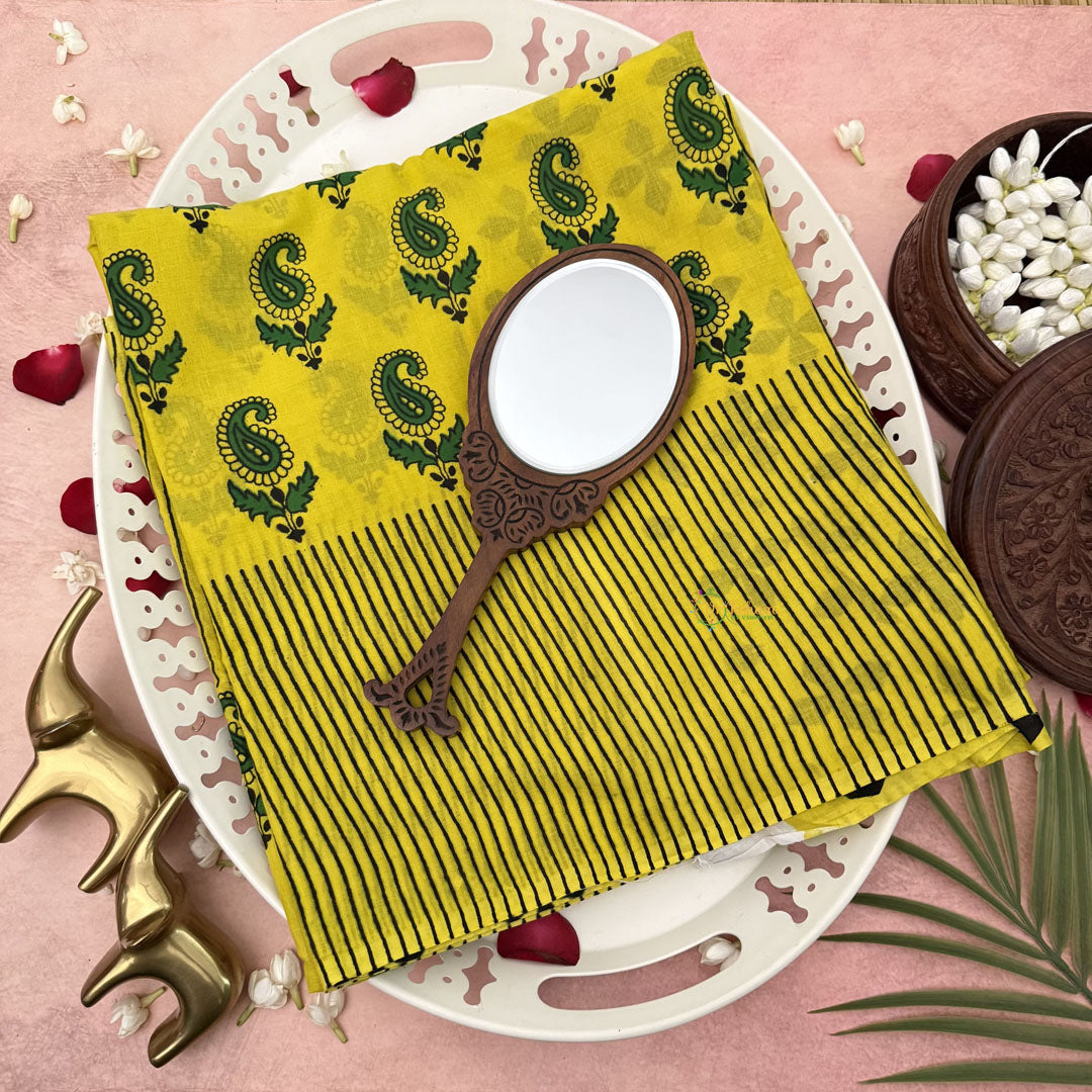 The Vriksham Yellow With Green Printed Cotton Mulmul Saree combines vibrant hues with delicate craftsmanship. Made from soft cotton mulmul, it offers breathable comfort and graceful drape. The subtle green prints on a bright yellow base create a refined and elegant look, perfect for enhancing your wardrobe with a touch of sophistication and traditional charm.