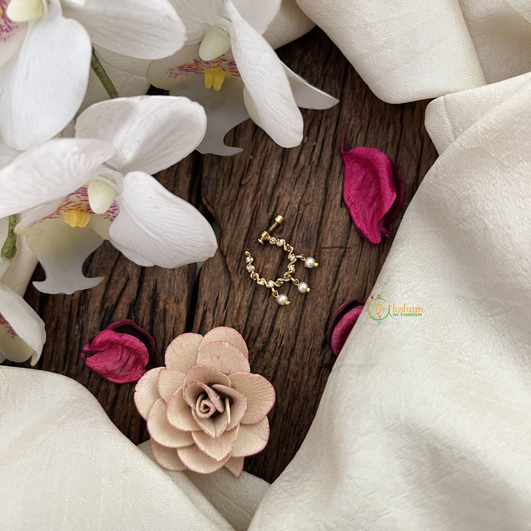 The Vriksham Zigzag Dot Naths features an elegant arrangement of red, white, and green pearls in a distinctive zigzag dot pattern. This finely crafted nose pin combines traditional motifs with contemporary design, offering a sophisticated accessory that adds subtle charm and vibrant color to any ensemble. Perfect for those seeking a unique yet refined statement piece.