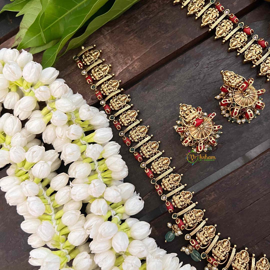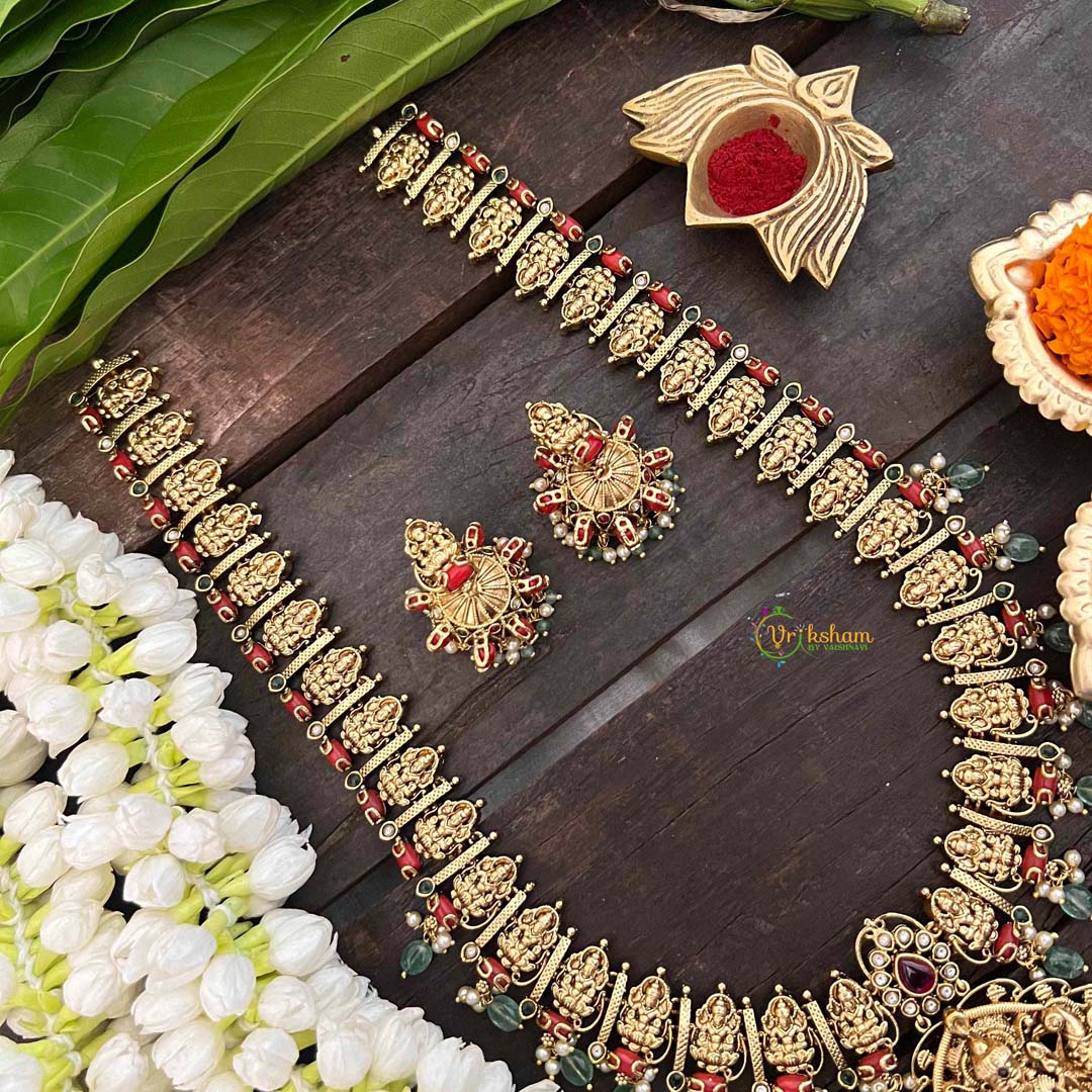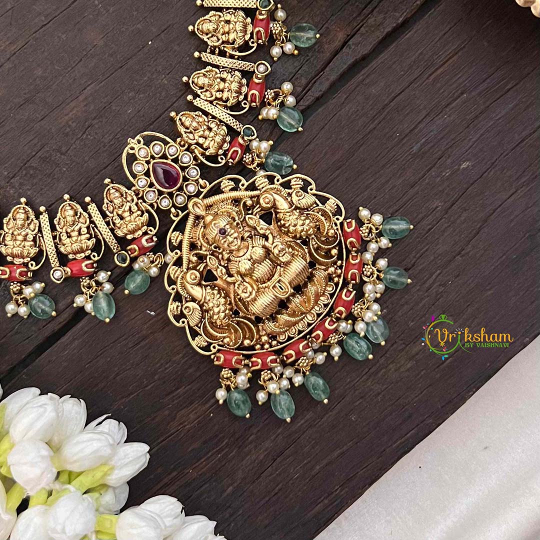 Introducing our Vriksham Precious Kemp Reversible Pendant Peacock Haram-Gold Bead, a luxurious and versatile piece that can transform any outfit. Adorned with precious kemp stones and a reversible peacock pendant, this haram necklace will add a touch of sophistication and elegance to your style. The green beads add a pop of color, making it a unique and eye-catching accessory. Elevate your look with this exquisite piece from Vriksham.
