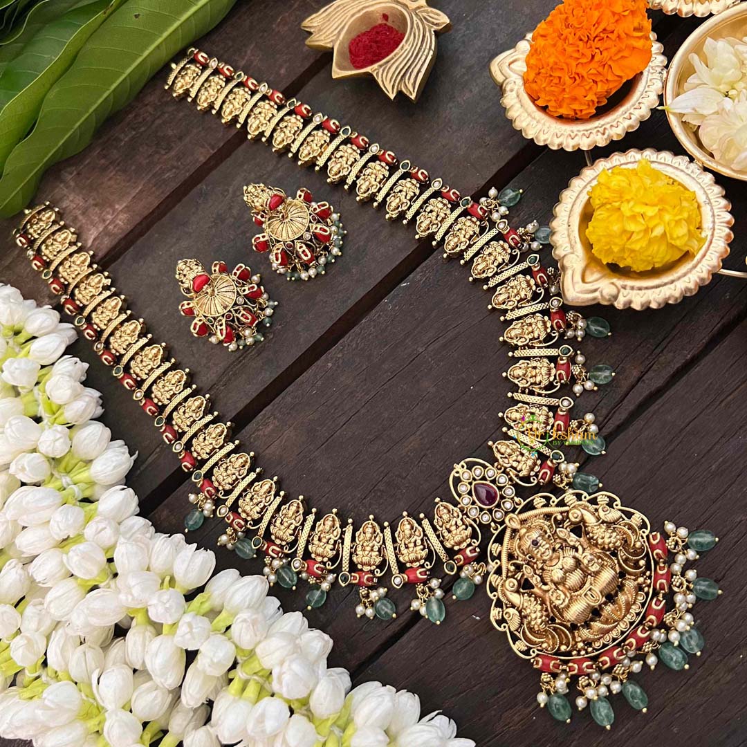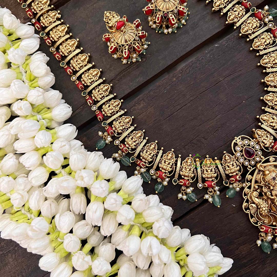 Indulge in opulence with our Deluxe Peacock Lakshmi Collar in a gorgeous shade of mint green, embellished with intricate beads and shimmering pearls. Elevate your look and radiate sophistication with this refined adornment. Includes coordinating earrings.Comes with matching earrings.