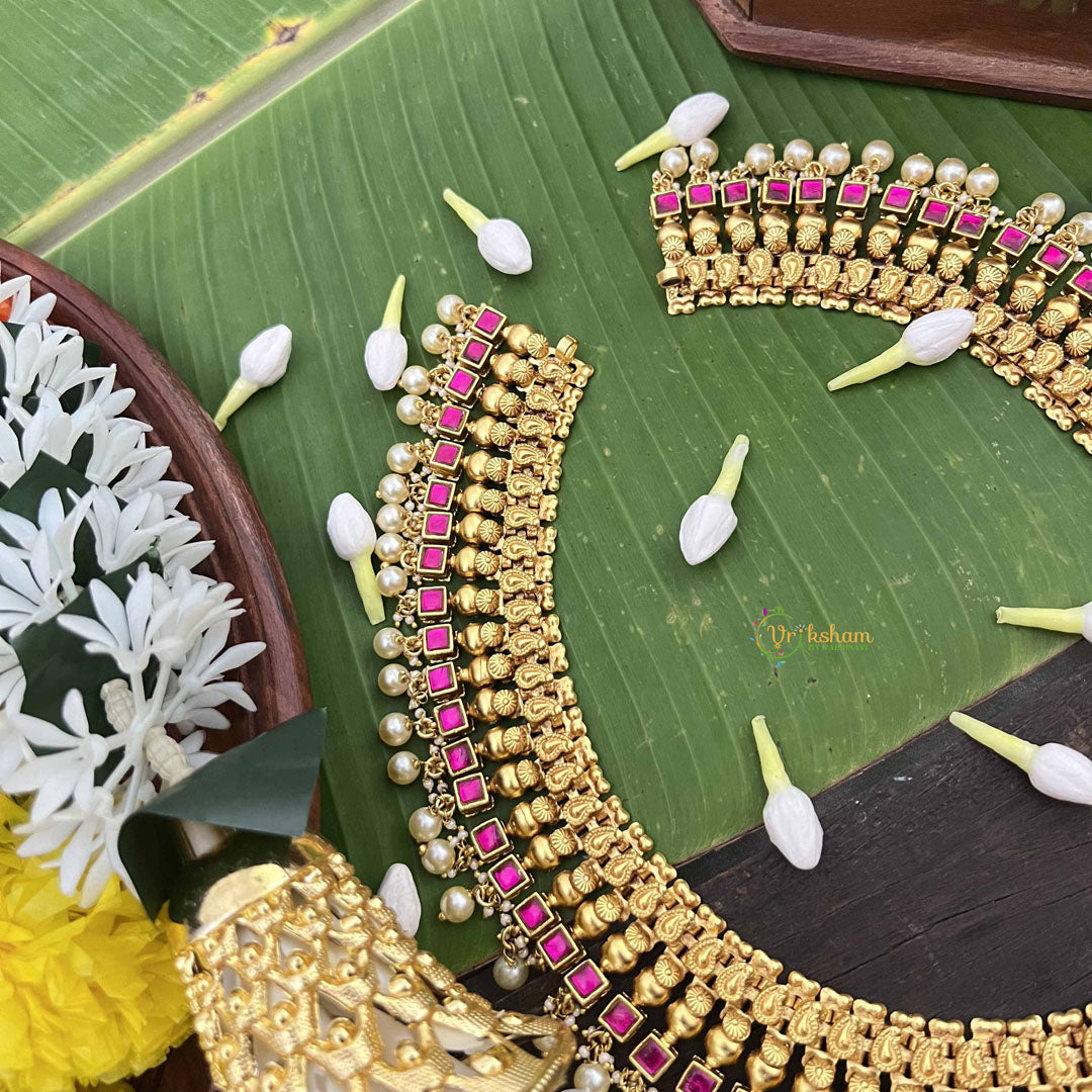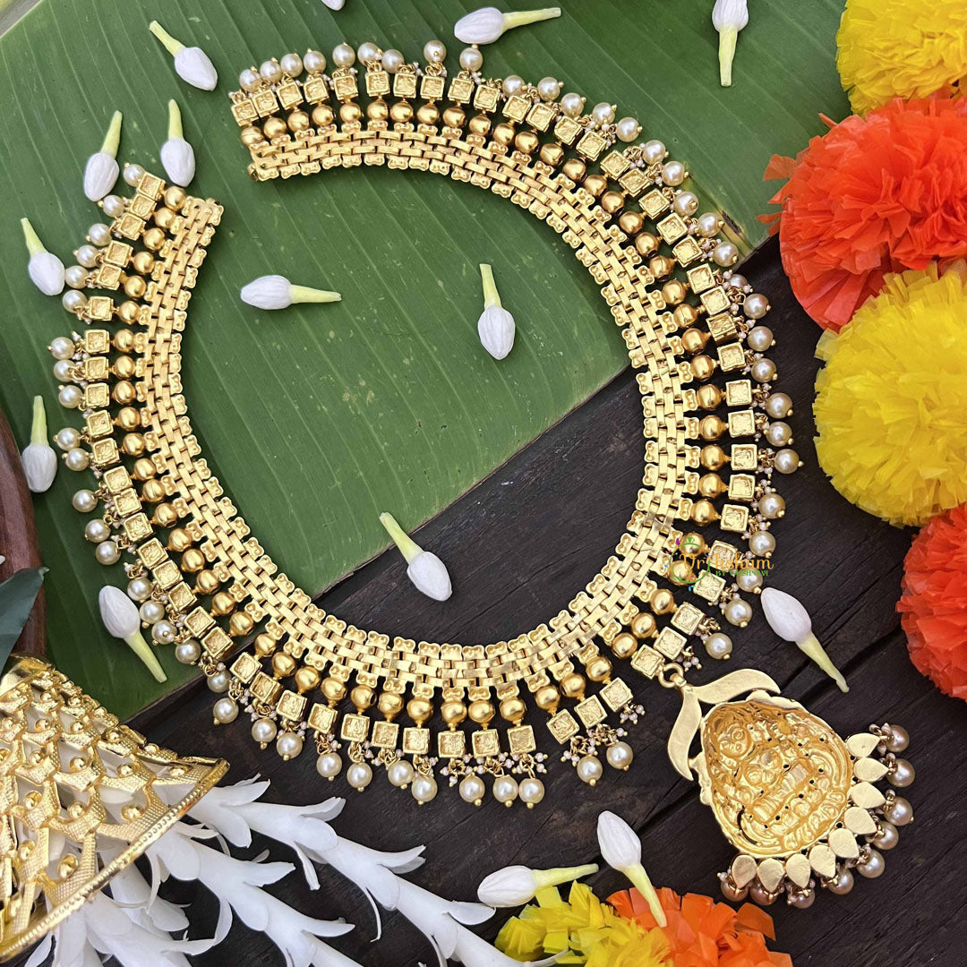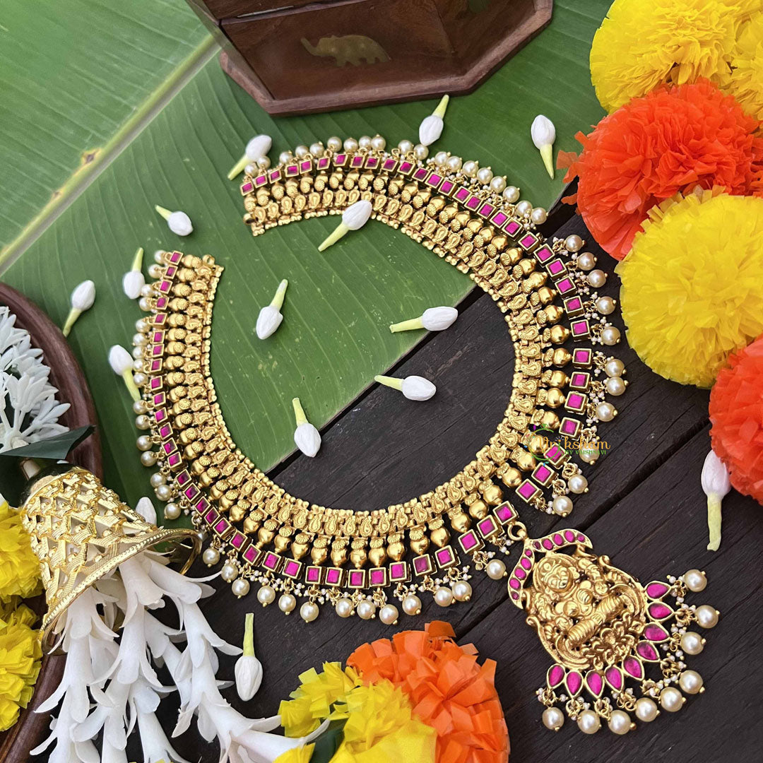 Discover timeless elegance with this dual-tone golden Kundan Jadau neckpiece, adorned with delicate pink pearls and inspired by the divine Lakshmi design. Handcrafted with meticulous attention to detail, this piece seamlessly blends traditional artistry with contemporary aesthetics. The luminous golden tones paired with soft pink pearls create a harmonious, feminine appeal perfect for weddings, celebrations, and festive occasions. The extended length allows for graceful draping and versatile styling with both traditional and modern attire. A sophisticated statement piece that honors heritage craftsmanship while adding refined glamour to your jewelry collection.