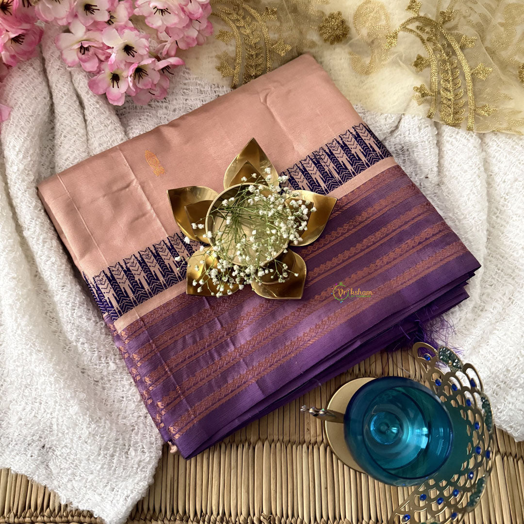Wheatish Beige Chinnalampattu Saree with Temple Copper Border and Dark Blue Pallu -Chinnalampattu sarees are typically handwoven using pure silk threads. The unique feature of these sarees lies in their border designs, which often include intricate patterns inspired by nature, temples, and traditional motifs. The pallu (the loose end of the saree) is also elaborately designed, adding to its elegance. Doesn't come with blouse -Saree only.