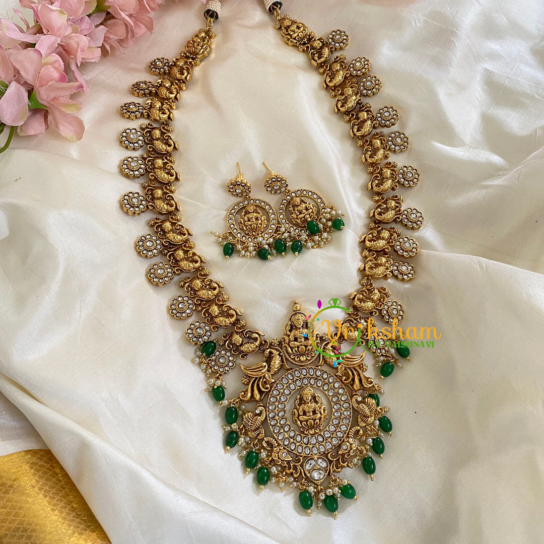White AD Stone Lakshmi Haram Neckpiece - Premium quality long neckpiece - complete white stones set lakshmi pendant temple neckpiece, comes with similar matching ear hangings. Green Bead Finish.