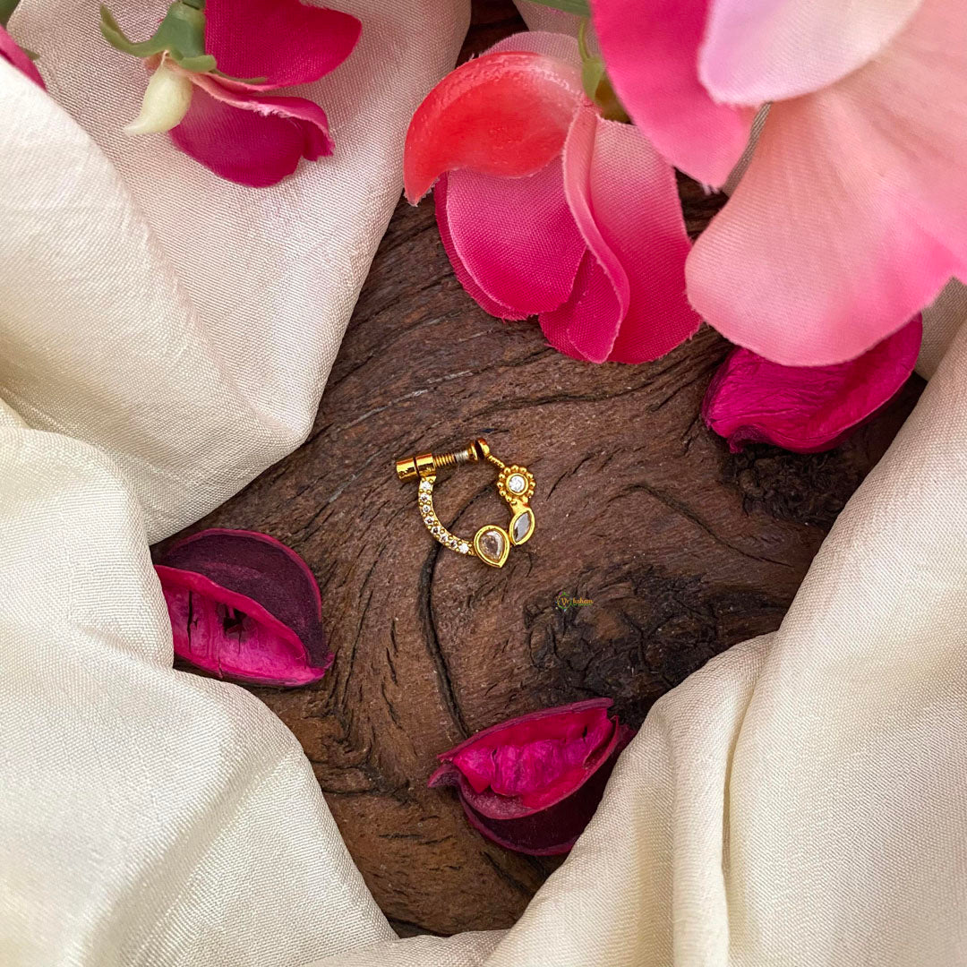 Transform your look with our exquisite AD Stone Nath/Nose Pin. Adorned with sparkling stones, this elegant piece adds a touch of glamour to any ensemble. Make a statement of elegance...