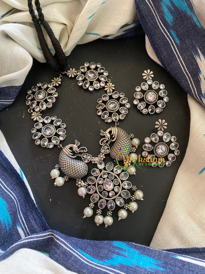 White AD Stone Peacock Neckpiece- Tilak shape stone studded pendant with pearl finish–neckpiece; comes with matching earring.