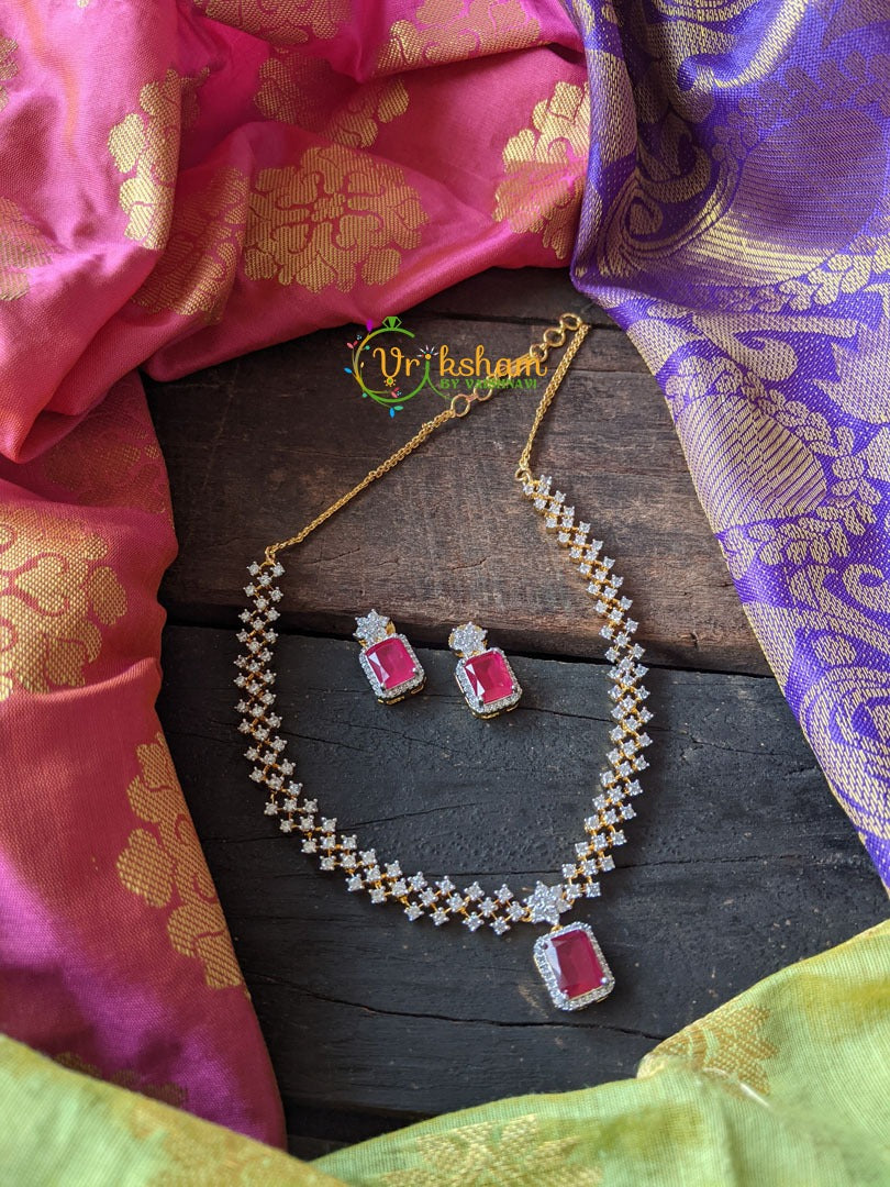 White AD stone Neckpiece with Pink centre stone -elegant simple short neckpiece , comes with matching ear drops.