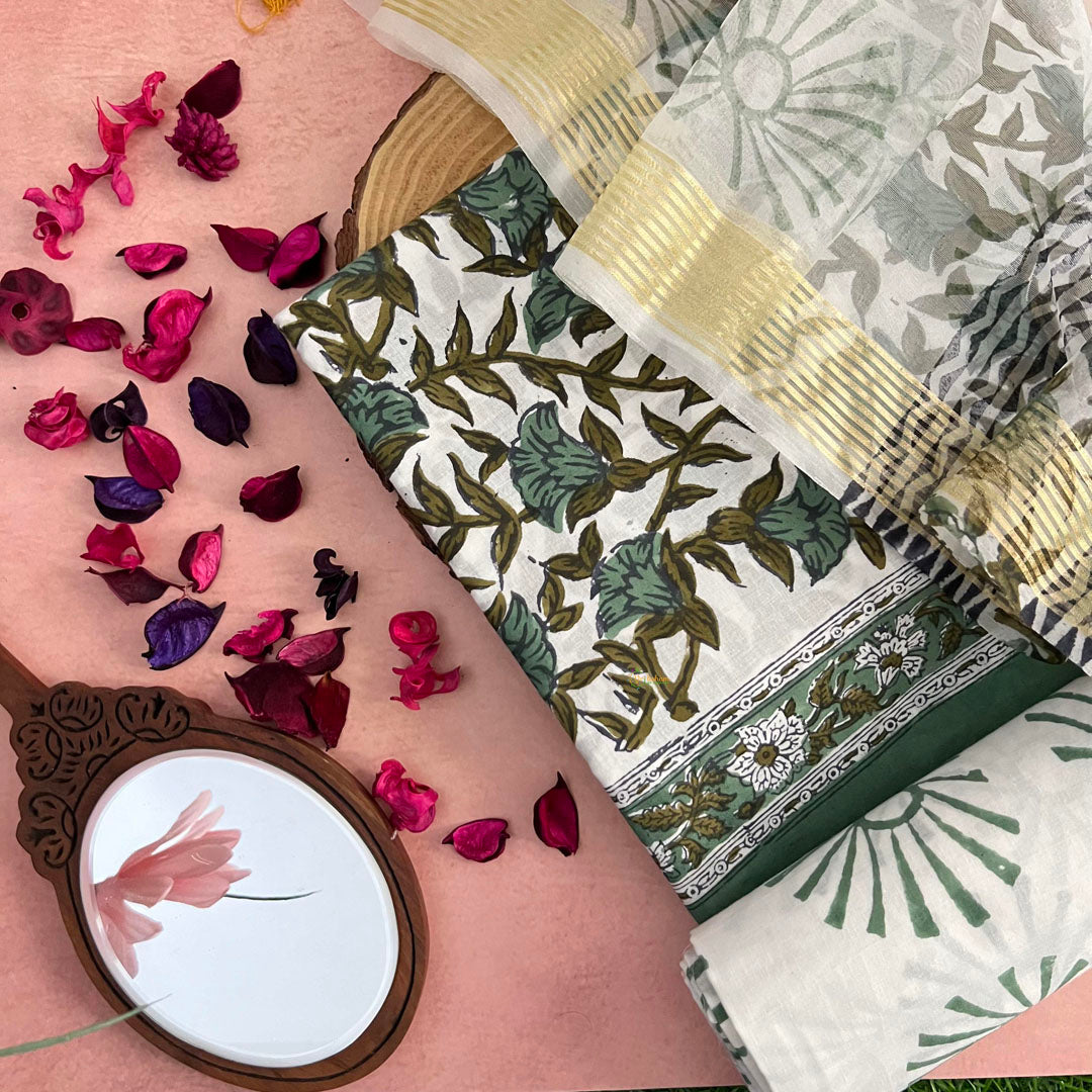 Elevate your style with our White Cotton Suit Material Set! Each piece is bagru printed and comes with a white bottom and organza dupatta. The lightweight cotton ensures comfort while the unique prints make you stand out. Upgrade your wardrobe now and make a statement with our exclusive set!
