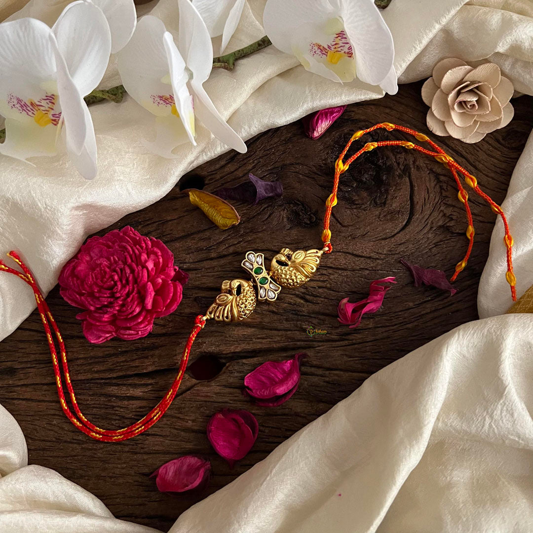 Celebrate Rakshabandhan in style with our exquisite Kundan Stone Dual Peacock Pendant Rakshabandha Rakhi! Featuring intricate Kundan stone work and a beautiful dual peacock pendant, this rakhi is not only a symbol of love and protection, but also a stunning piece of jewelry that your sibling will cherish for years to come. Show your love and strengthen your bond with this unique and elegant rakhi.