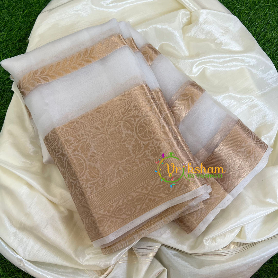 White Organza Silk Saree -Organza Kota Silk - Veldhari like pattern throughout the saree; comes with Blouse attached. Gold like traditional border and pallu.