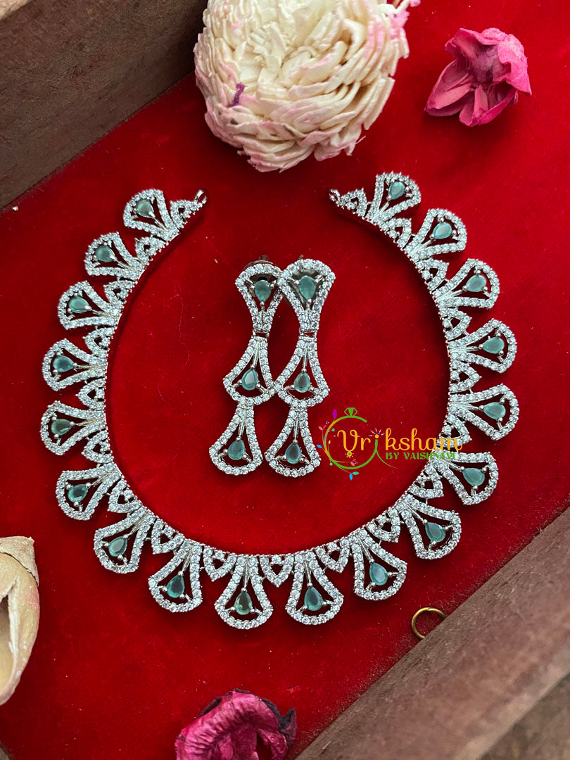 White Tone American Diamond Choker-Sea Green AD Stone studded Neckpiece-set of choker and earring; swing pattern neckpiece.