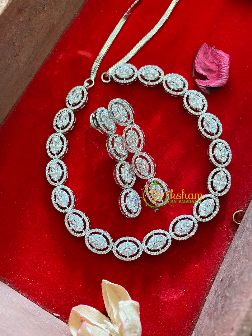 Premium White Tone American Diamond Choker-Cell white stone studded american diamond jewelry with full white stone -set of high neck choker, ear danglers.