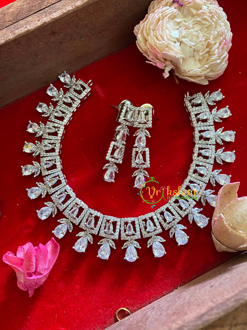 White Tone American Diamond Choker-Tear Drop-WHITE TONE imitation jewelry set; Comes with a pair of similar danglers.