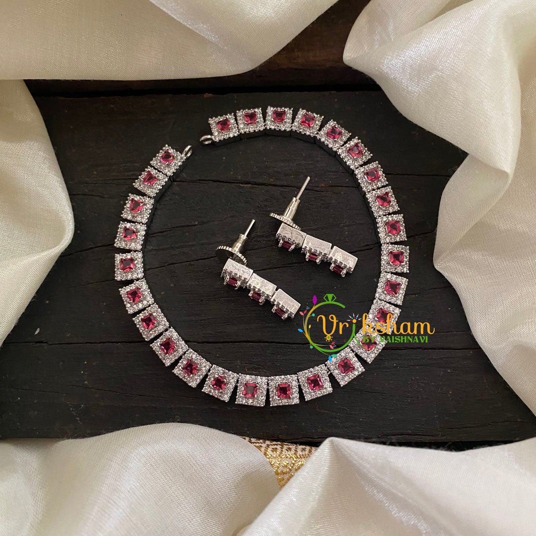 White Tone American Diamond Choker Short Neckpiece-Red - NO Pendant-AD stone studded jewelry -set of choker and earrings