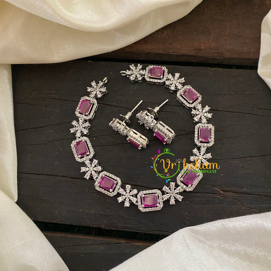 White Tone American Diamond Choker Short Neckpiece-Pink-G7027