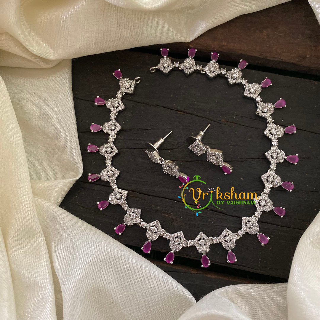 White Tone American Diamond Choker Short Neckpiece-Pink - NO Pendant-AD stone studded jewelry -set of choker and earrings