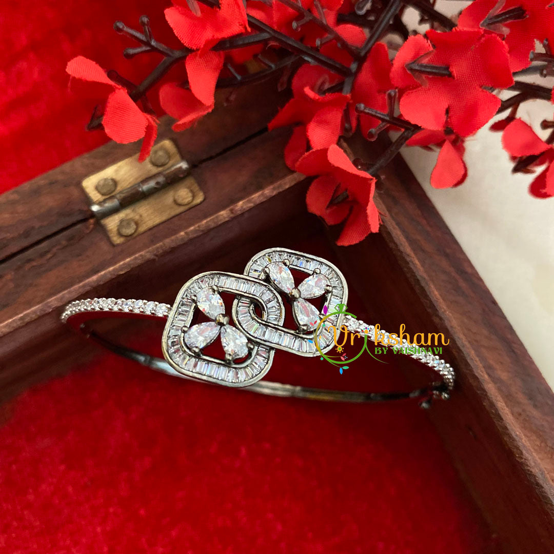 White Tone American Diamond Twin Stone Bracelet-White -tri petal patterns AD stone studded across. Openable Kada type bracelet.