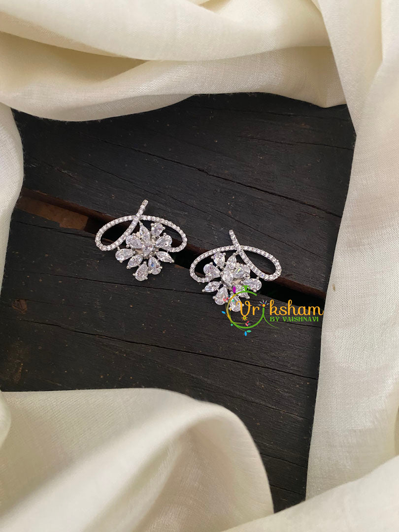 White Tone American Diamond Stud -Twisted Flower -Designer wear ad earrings; comes as a pair.