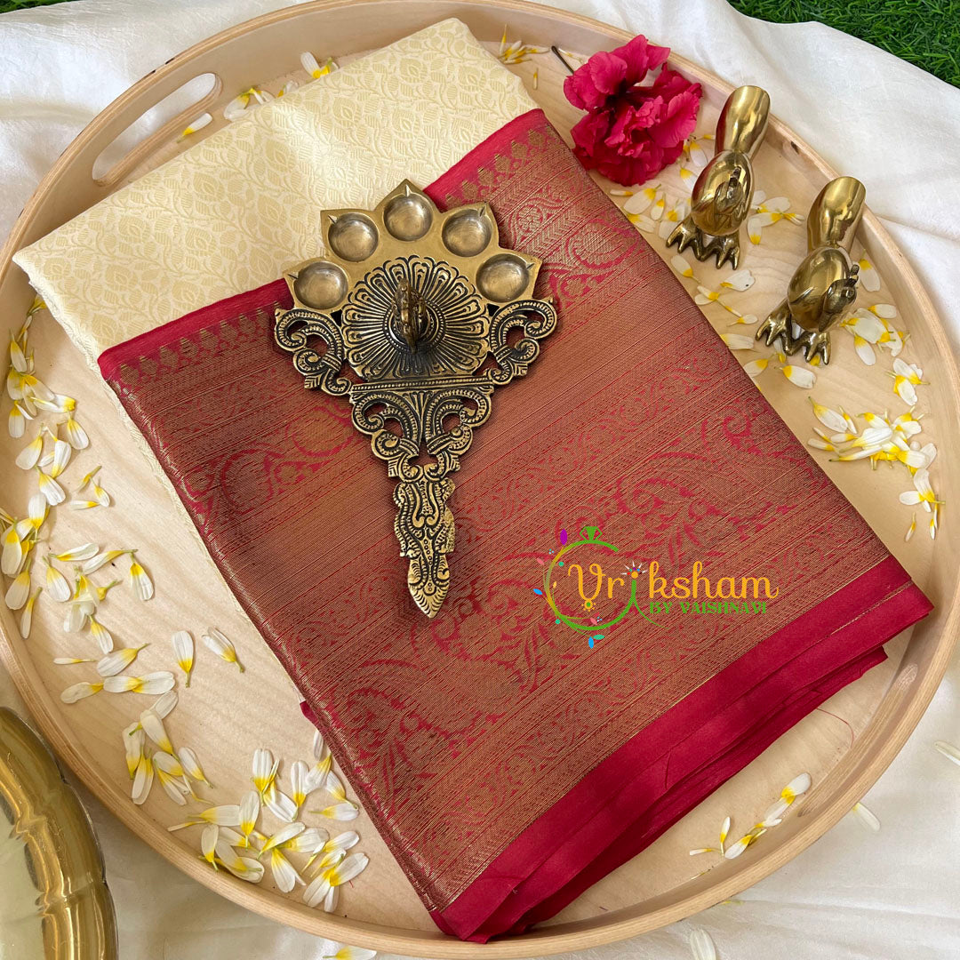 Half White with Red Kora Muslin Saree - Festive wear saree –work throughout the saree; comes with Blouse attached. Two side border- one bigger.