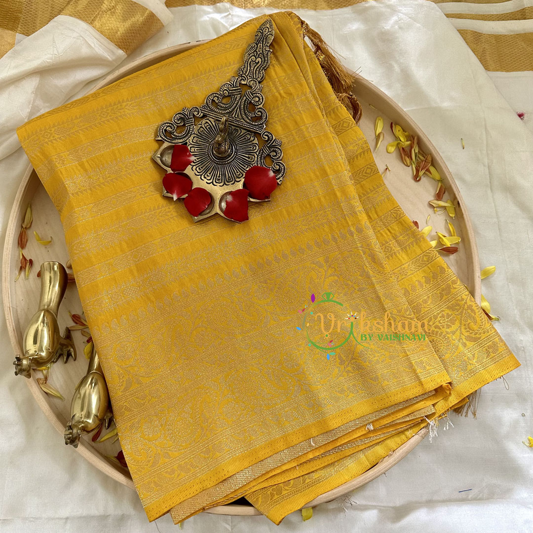 Yellow Georgette Saree – Festive wear saree – Veldhari lines work throughout the saree; comes with Blouse attached. Thread work two side traditional border.