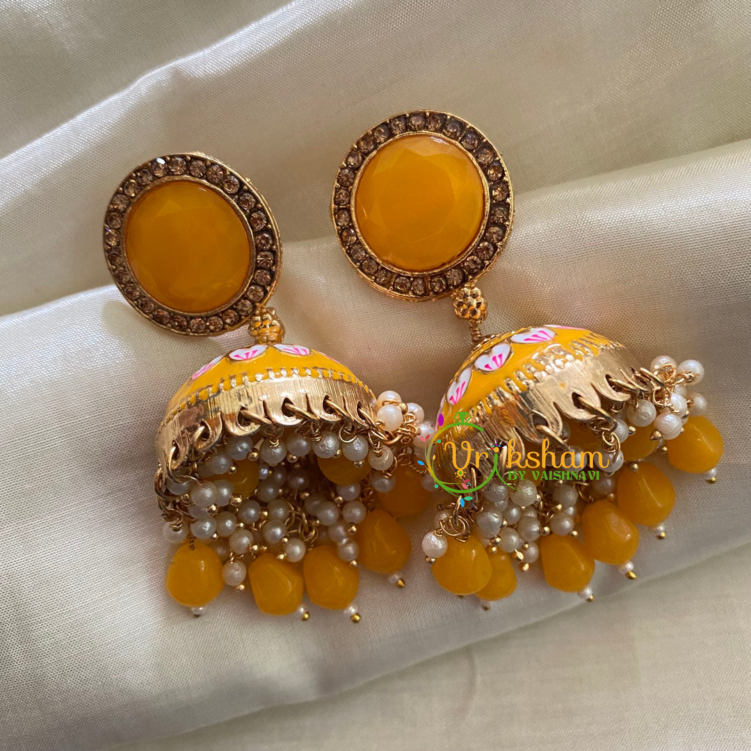 Yellow Meenakari Jhumkas-Hand painted-Round Stud with hand painted Jhumkas base. Bead and Pearl finish. Medium size.
