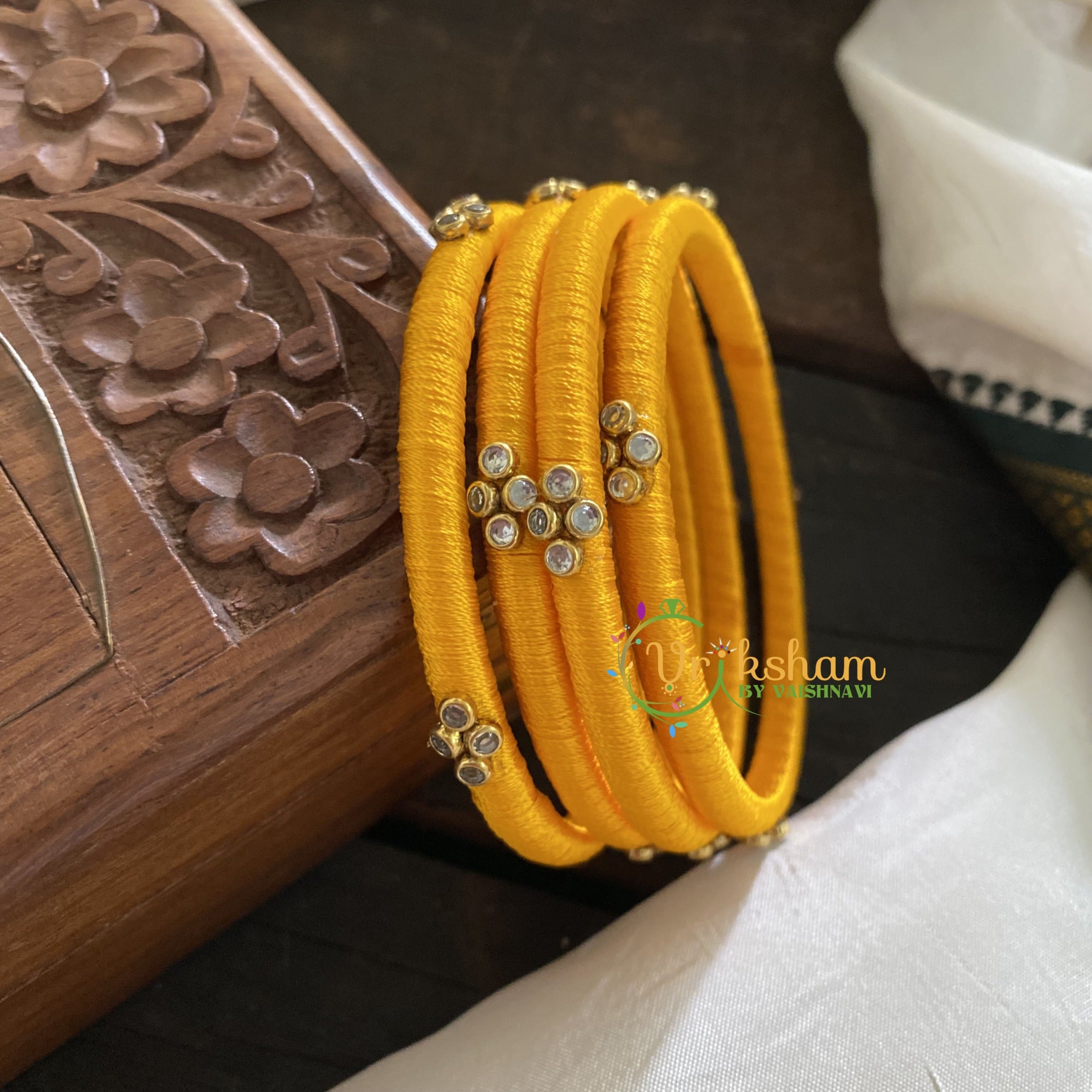 Yellow Silk Thread Bangles with White Stone- white glossy stone set festive bangles , Comes as 4 bangles only.