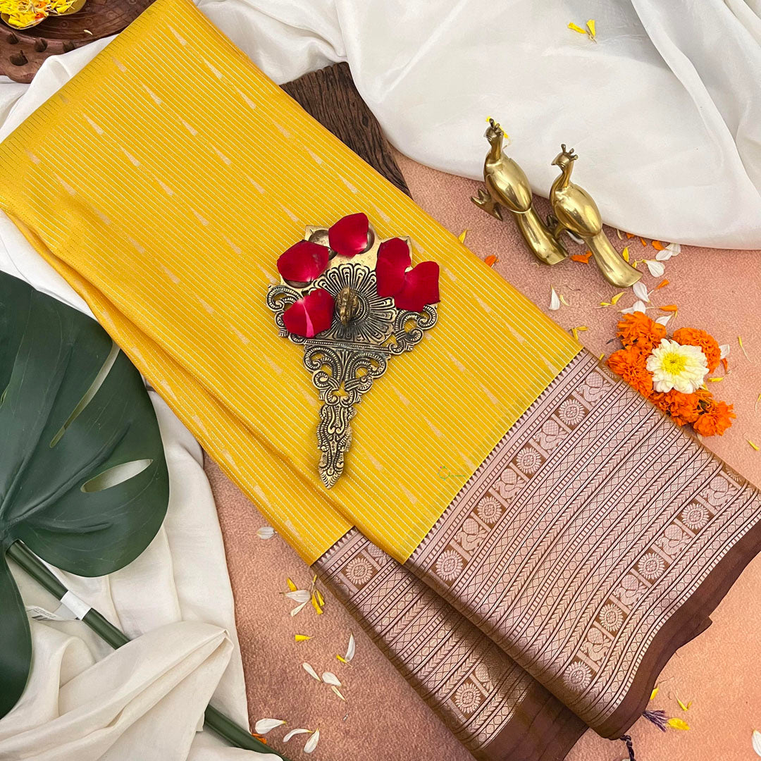 This stunning Yellow With Brown Border Kanchi Silk Saree-VS3912 is adorned with an intricate Vairaoosi design all over, enhanced by delicate golden zari work. The rich yellow color and luxurious silk fabric exude elegance and sophistication, making it the perfect choice for any special occasion. Embrace the art of draping in this luxurious saree.