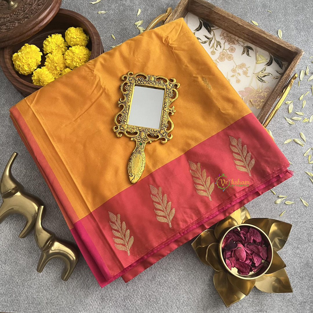 Indulge in the luxurious charm of our Yellow Soft Silk Saree. The delicate silk fabric drapes beautifully, while the hot pink pallu tassels add a touch of vibrance. Adorned with intricate copper zari work, this saree is a masterpiece of elegance and style. Elevate your wardrobe with this exclusive saree.